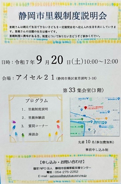 静岡市里親制度説明会を開催します。 日時:令和7年9月20日(土)10:00-12:00 場所:アイセル21 3階33集会室